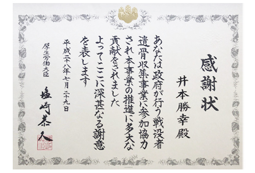 戦没者遺骨収集事業について、平成28年度 厚生労働大臣表彰を受賞しました