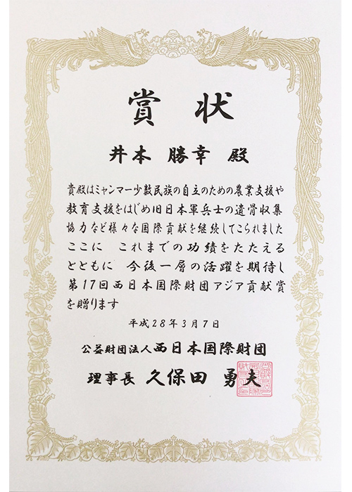 公益財団法人「西日本国際財団」による第17回(平成27年度)西日本国際財団アジア貢献賞を受賞しました。